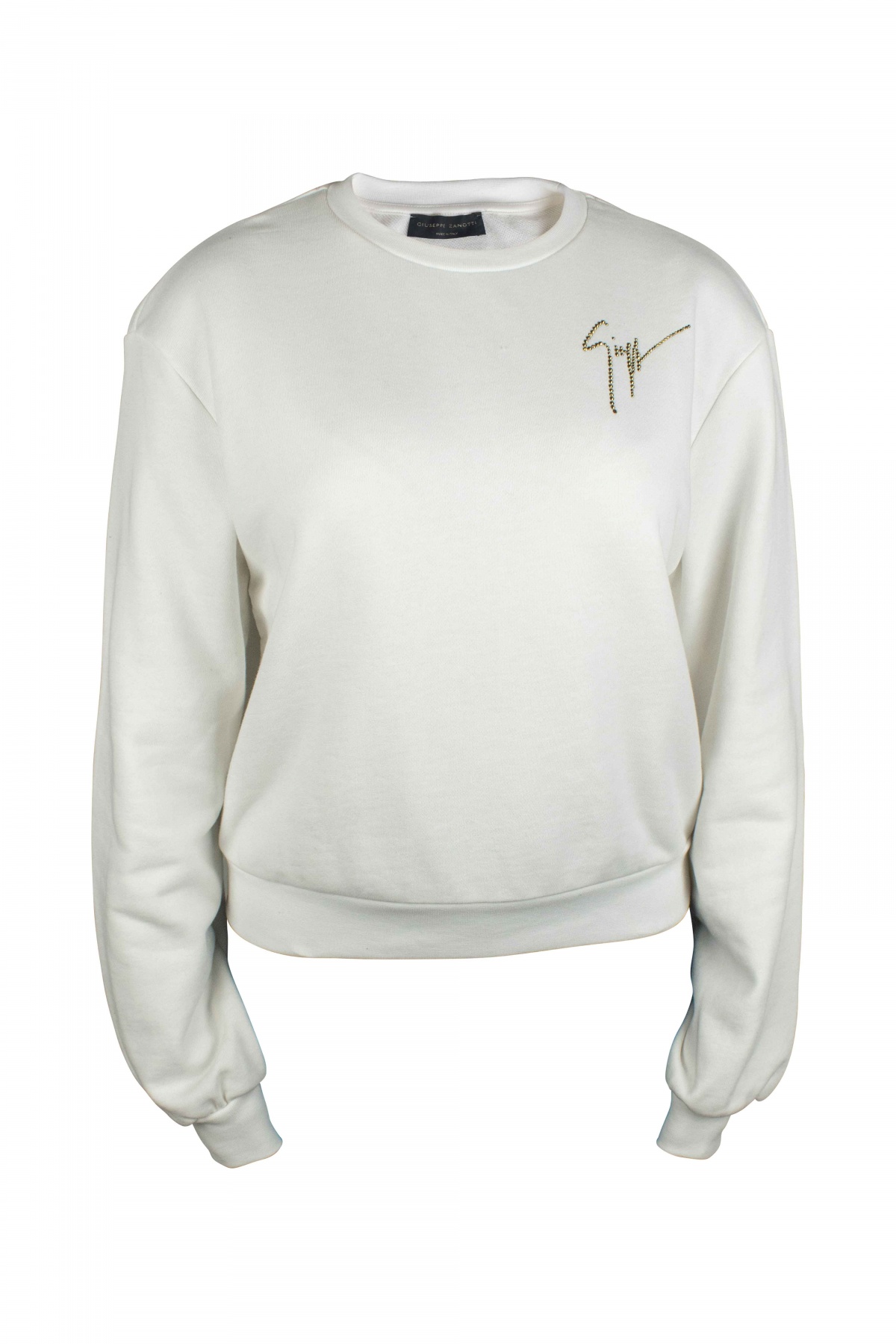 Short sweatshirt Giuseppe Zanotti. White cotton. Ribbed edges. Crew neck. Signature gold rhinestone embroidery on chest. Made in Italy.