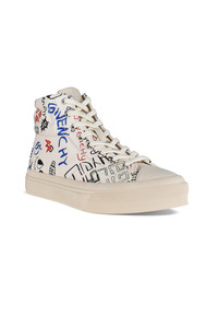 Givenchy City high-top sneakers in beige leather. Multicolored graffiti print all over the shoe. Quilted reinforcements around the ankle. Engraved Givenchy metal plate on heel. White lace-up closure. Rubber sole. 100% calf leather.