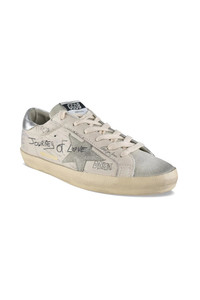 Sneakers Golden Goose Deluxe Brand Superstar model in beige leather. Grey suede upper. Writings all over the shoe. Grey suede star patch on the side. Silver leather counter with logo. Logo on the suede tongue. Beige lace-up fastening. Rubber sole. Made in Italy.
