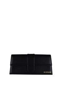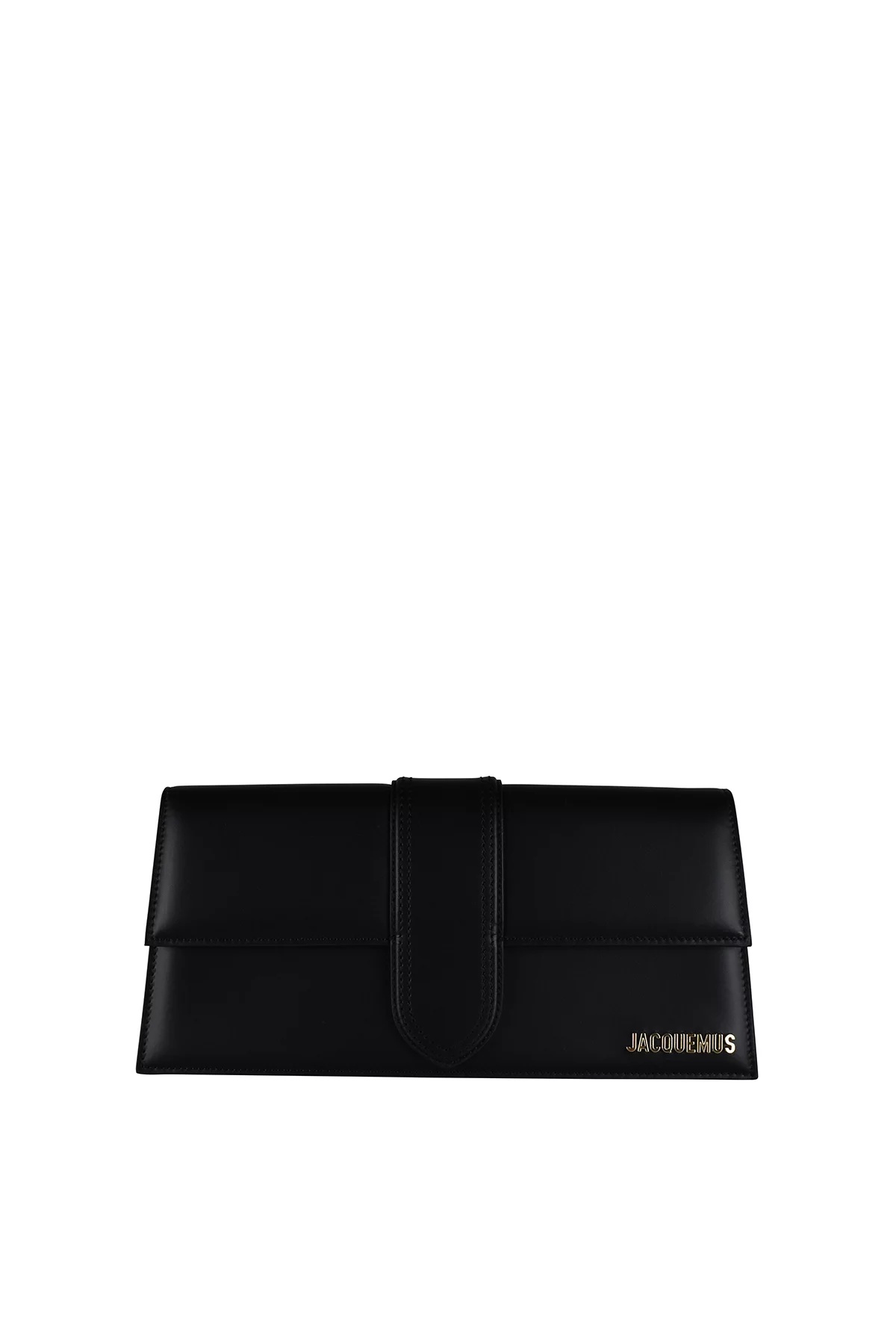 Jacquemus Le Bambino Long bag in black leather. Gold Jacquemus logo on front. Magnetic flap closure. One patch pocket on back. Slim shoulder strap. Dimensions: 28 x 13.5 cm. 100% leather. Made in Italy.