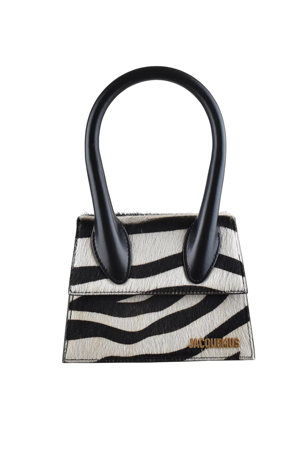 Jacquemus Le Chiquito Moyen bag in black leather and foal. Black and white zebra motif. Gold Jacquemus logo on front. Magnetic flap closure. One inside pocket. Removable shoulder strap. Dimensions: 18 x 13.5 cm. 100% leather. Made in Italy.