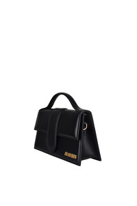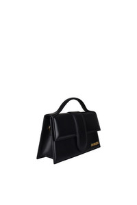 Jacquemus Le Grand Bambino bag in black leather. Gold Jacquemus logo on front. Magnetic flap closure. One patch pocket on back. Small handle. Removable shoulder strap. Dimensions: 23.5 x 13 cm. 100% leather. Made in Italy.