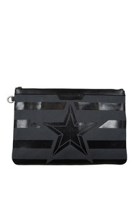 Derek Jimmy Choo clutch bag in canvas. Stripes and stars on the front. Interior pockets and zip closure. Dimensions: length 26 cm x width 38 cm. Made in Italy.