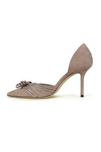 Jimmy Choo Kaitence 85 pointed-toe pumps in pink suede with crystal-embellished bow. 8.5 cm heel. Leather sole. Made in Italy.