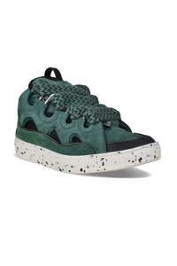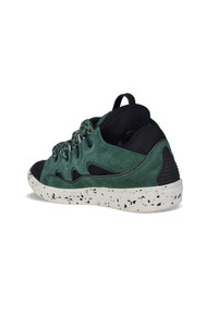Lanvin Curb sneakers in green suede. Navy blue mesh inserts. Navy rubber toe cap and counter. Embossed logo on side. Oversized tongue with logo plaque. Double green woven laces with herringbone pattern. Perforated round toe. White sole with rubber spots. Made in Italy.