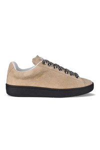 Lanvin Lite Curb sneakers in beige suede. Embossed logo on side in gold. Logo label on tongue. Two-tone lace-up closure with herringbone-woven Curb motif. White Mother & Child logo counter. Black gum sole. Round toe.