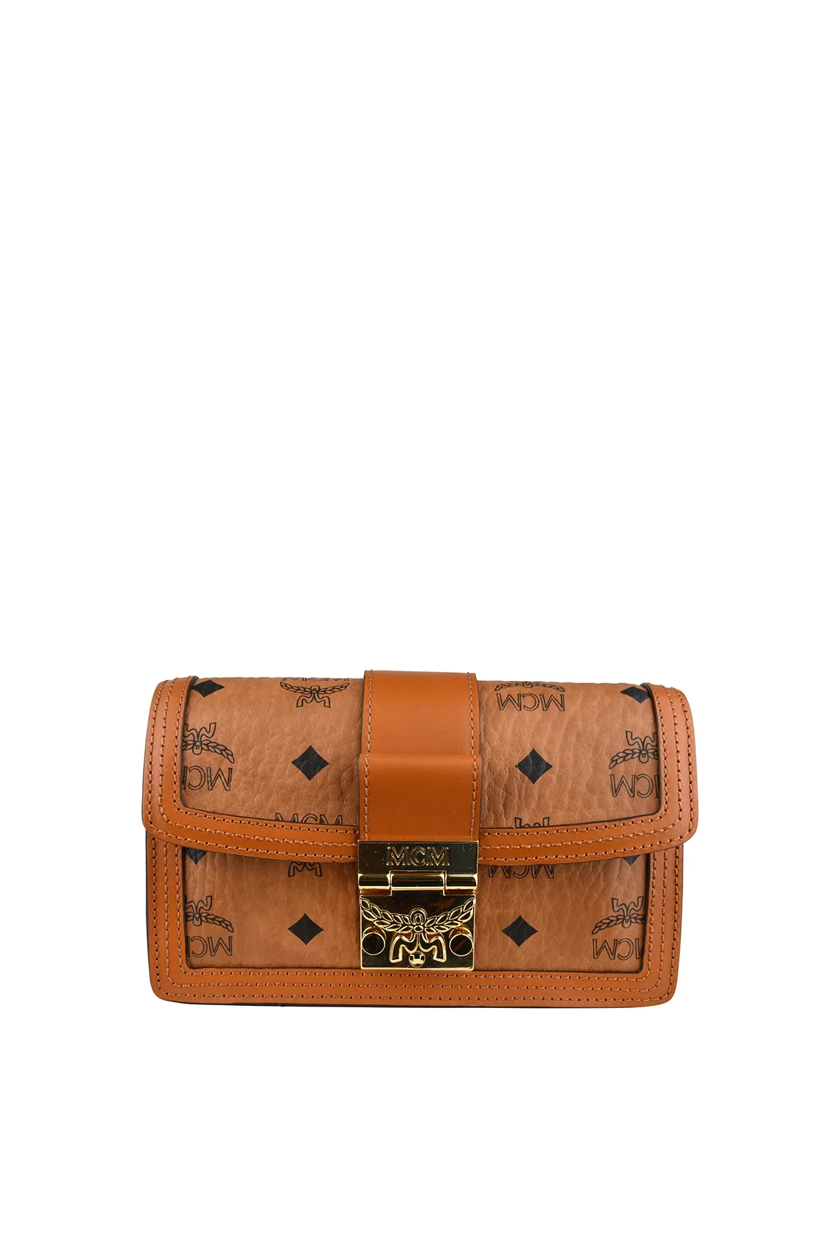Tracy handbag MCM brown calfskin. Monogrammed motif throughout. Top flap with engraved latch closure. Gold-tone metal trim. Removable chain shoulder strap. Outside back pocket. Size: 19 x 11 x 5 Made in Italy.