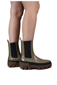 Moncler boots, Coralyne model in brown patent leather. Elastic side inserts on the sides. Back slip-on tongue. Heel strap with Moncler lettering. Notched sole with rubber logo. 100% leather. Made in Italy.