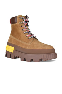 Moncler "Mon Corp" boots in camel suede. Brown leather yoke. Three-tone lace fastening. Three-tone fabric back tongue. Rubber outsole with yellow logo stripe. 6.5 cm platform. Made in Italy.