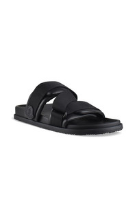 Mon Summer slide in black Moncler leather. Crossed straps in polyester with logo. Velcro straps. Logo patch on outside. Flat sole. Made in Italy.