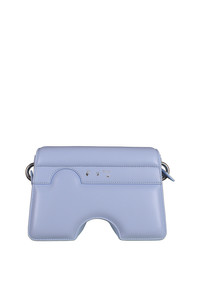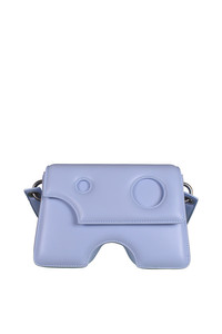 Off-White shoulder bag in smooth calf leather. Burrow 22 model in light blue color. Iconic cutouts on the whole. Adjustable leather shoulder strap with pin buckle. Black logo embossing at back. Magnetic snap flap. Interior card slots. Black and blue polished leather lining. Silver hardware. Dimensions: length 22 cm x height 15 cm x width 8 cm. Made in Italy.