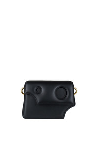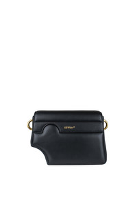 Off-White shoulder bag in black leather. Burrow 22 model. Asymmetrical design. Emblematic cut-outs throughout. Two removable shoulder straps: one with chain links and one in adjustable leather. Printed logo on back. Flap closure. Card slots inside. Gold-plated finish. Dimensions: height 17 cm x width 20 cm x depth 7 cm. Made in Italy.