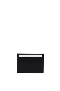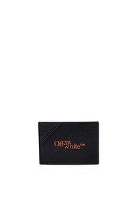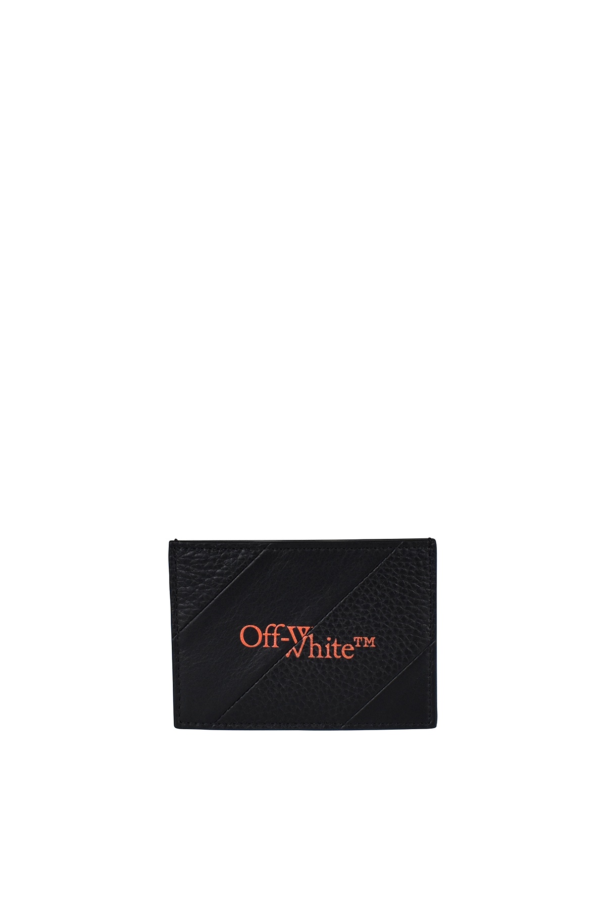 Off-White card holder in black leather. Diagonal stripes in smooth and grained leather. Printed logo on orange front. Credit card slots and central slot. 100% leather. Made in Italy.
