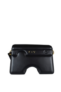 Off-White shoulder bag in smooth calf leather. Burrow 22 large model in black color. Iconic cutouts on the whole. Adjustable leather shoulder strap with pin buckle. Gold logo embossing at back. Magnetic snap flap. Interior card slots. Red and black polished leather lining. Gold finish. Dimensions: length 32 cm x height 20 cm x width 11 cm. Made in Italy.