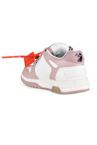 Out Of Office low top sneakers in white and pink leather. Two-tone design with the brand's iconic arrow. Red plastic Zip Tie tag. Lace-up closure. Flat rubber sole. Made in Italy.