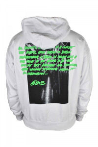 White and green Off-White hoodie. Graphic print on the front. Green signature writing. Graphic print on back. Drawstring hood. Oversized fit. Straight hem. 100% cotton.