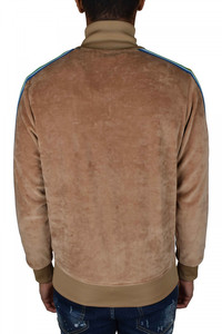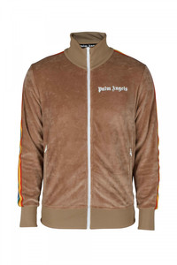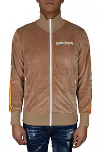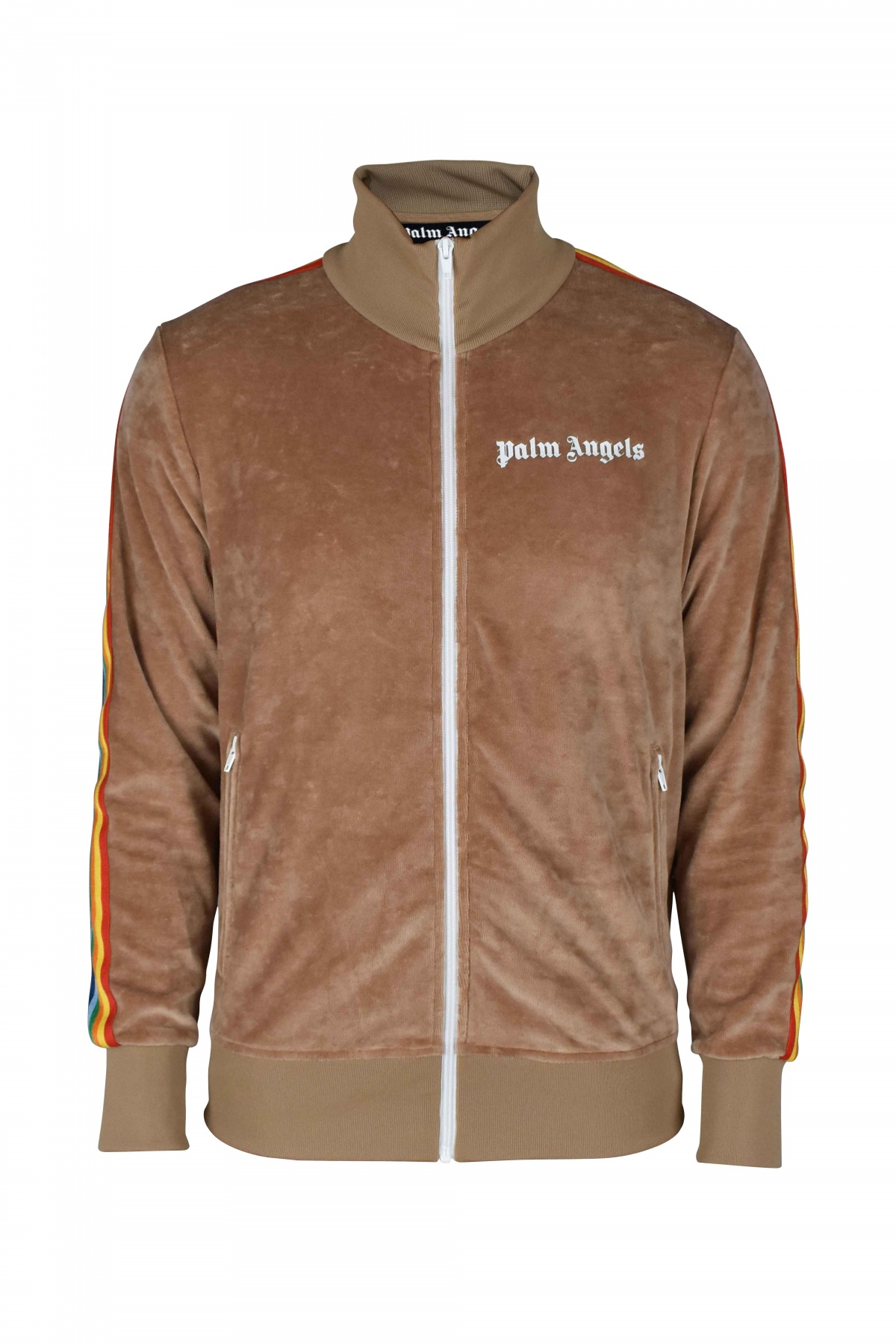 Camel jacket Palm Angels in velvet. White logo printed on the chest. Two multicolored stripes on the sleeves. Ribbed edges. High collar. White zip closure. Two side zippered pockets. Made in Italy.