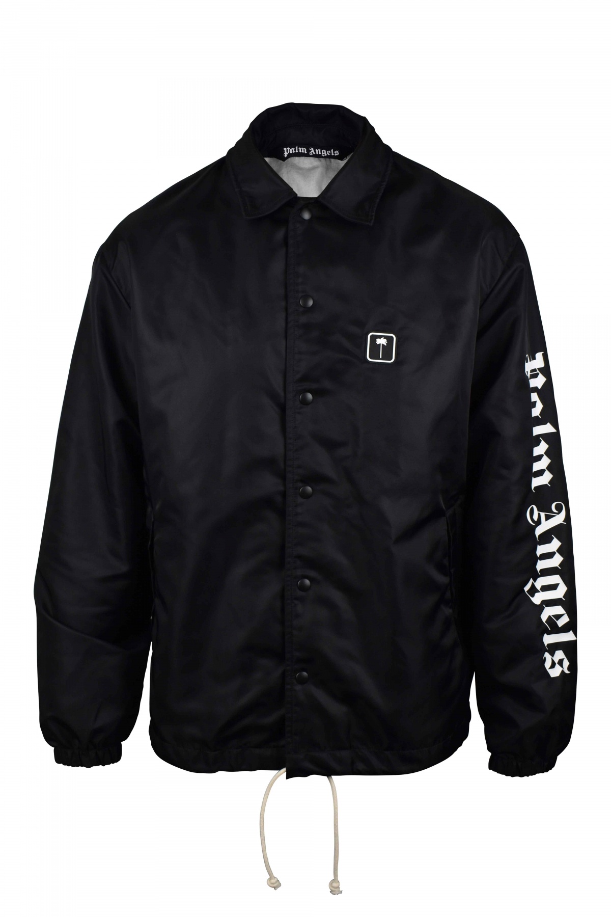 Palm Angels black windbreaker jacket in polyamide. Palm logo patch on front. White printed logo on left sleeve. Snap closure. Elasticated hem. White drawstrings on bottom. Side pockets with snap closure.