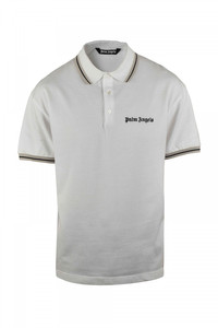 Palm Angels white polo shirt. Logo printed in black on chest. Striped trim in beige and black. Short sleeves. Button-down collar. 100% cotton. Made in Italy.