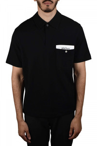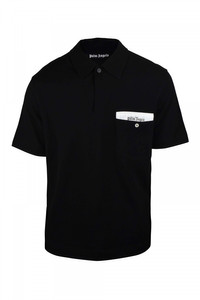 Palm Angels black polo shirt. Patch pocket with button on chest. Logo patch on white pocket. Short sleeves. Button-down collar. 100% cotton. Made in Italy.
