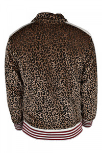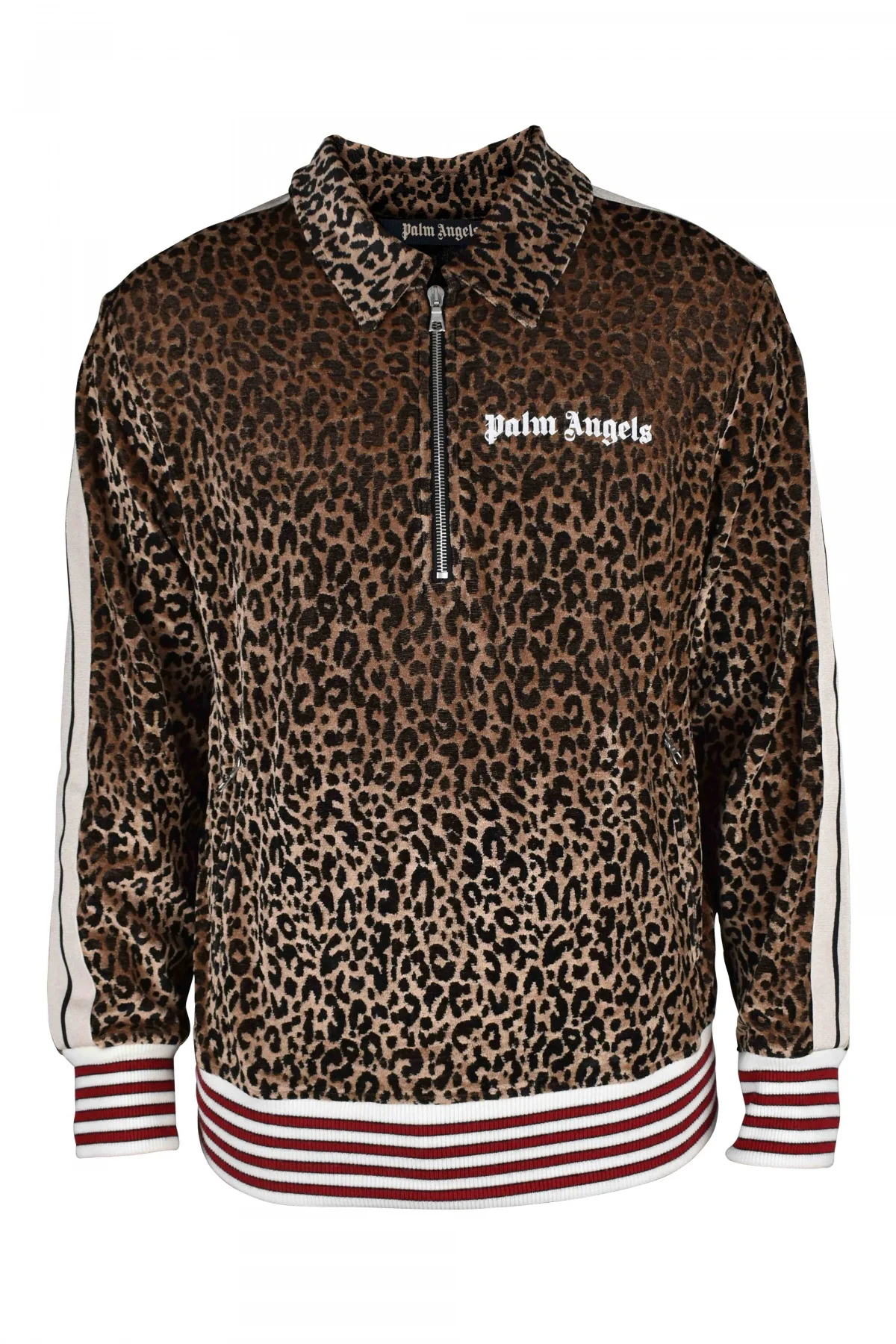 Brown Palm Angels leopard print sweatshirt. Brand logo printed on chest. Front zip fastening. Long sleeves with white stitching. Classic collar. Red striped trim. Made in Italy.