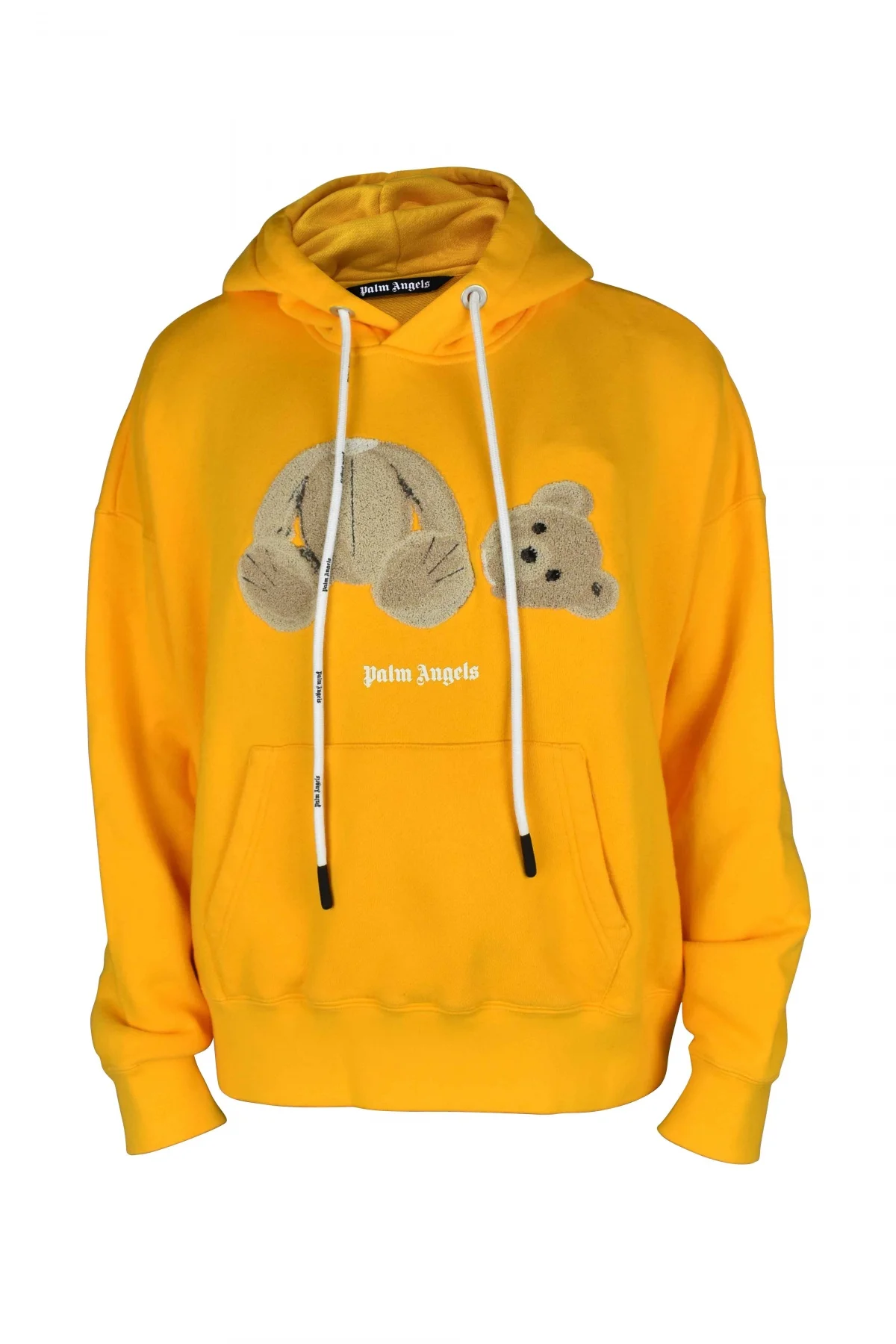 Yellow Palm Angels sweatshirt. White drawstring hoodie. Teddy Bear signature print. White Palm Angels logo at front. Kangaroo pocket at front. Ribbed edges. 100% cotton. Made in Italy.