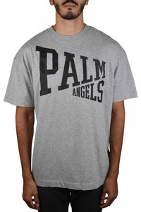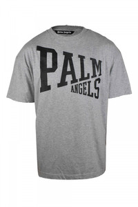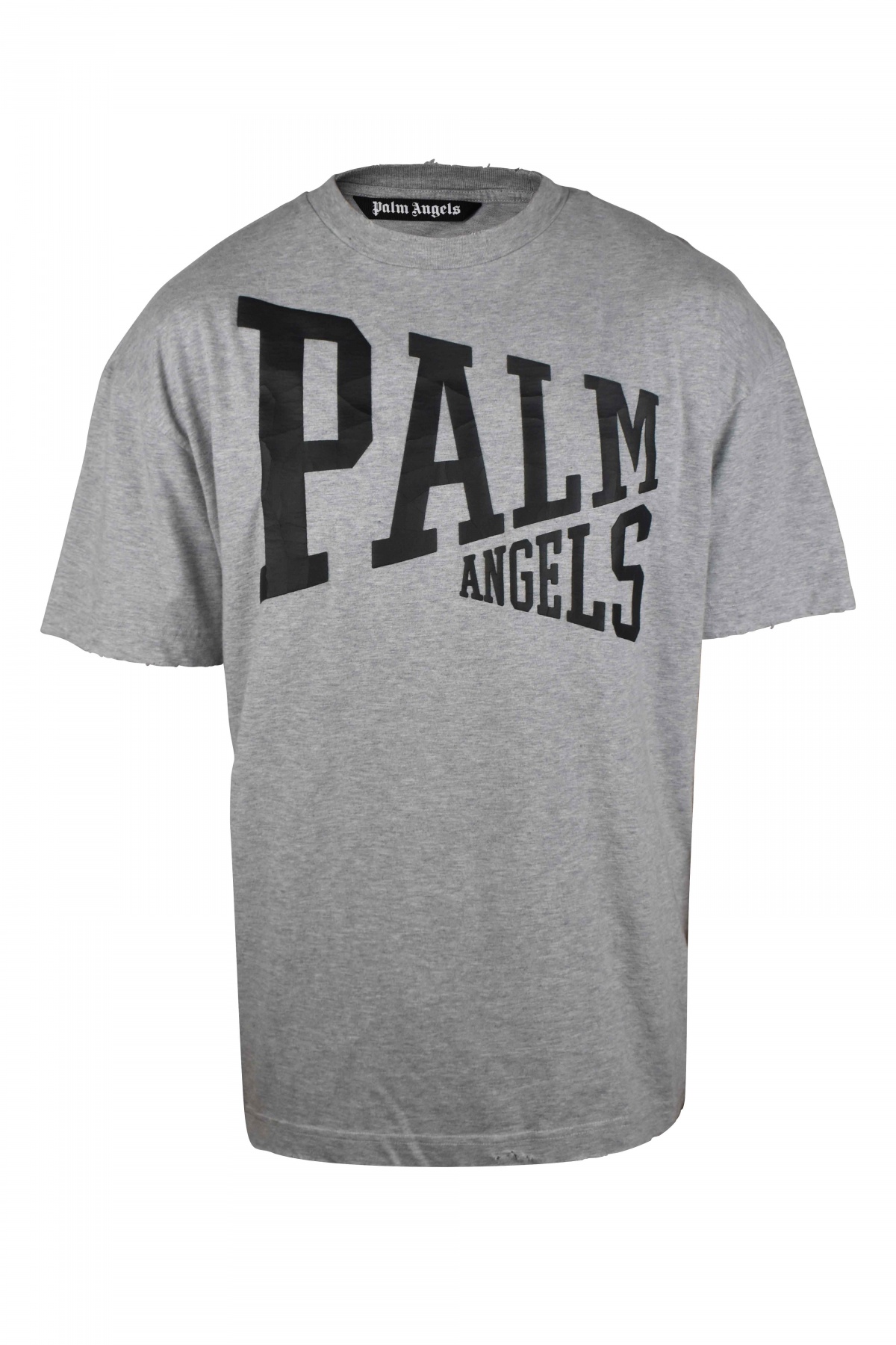 Grey cotton T-shirt with vintage Palm Angels effect. Cracked black logo printed on front. Short sleeves. Round collar. Made in Italy.