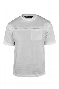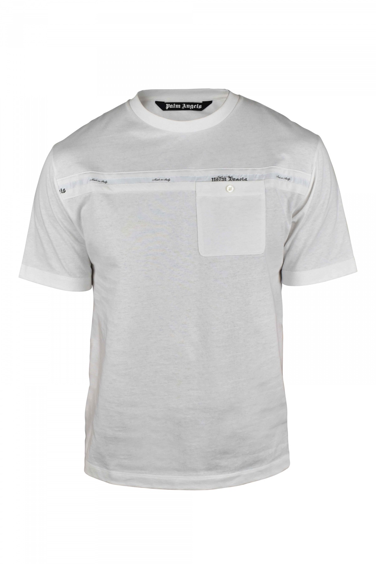 Palm Angels white cotton T-shirt. One-button front chest pocket. White horizontal stripe with black logo on front. Short sleeves. Round collar. Made in Italy.