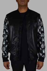 Philipp Plein bomber jacket in black leather with zip closure. Details of white designs on the leather sleeves. Black elastic at the waist and cuffs. Black PP logo plate on the front. Side pockets. Made in Italy.