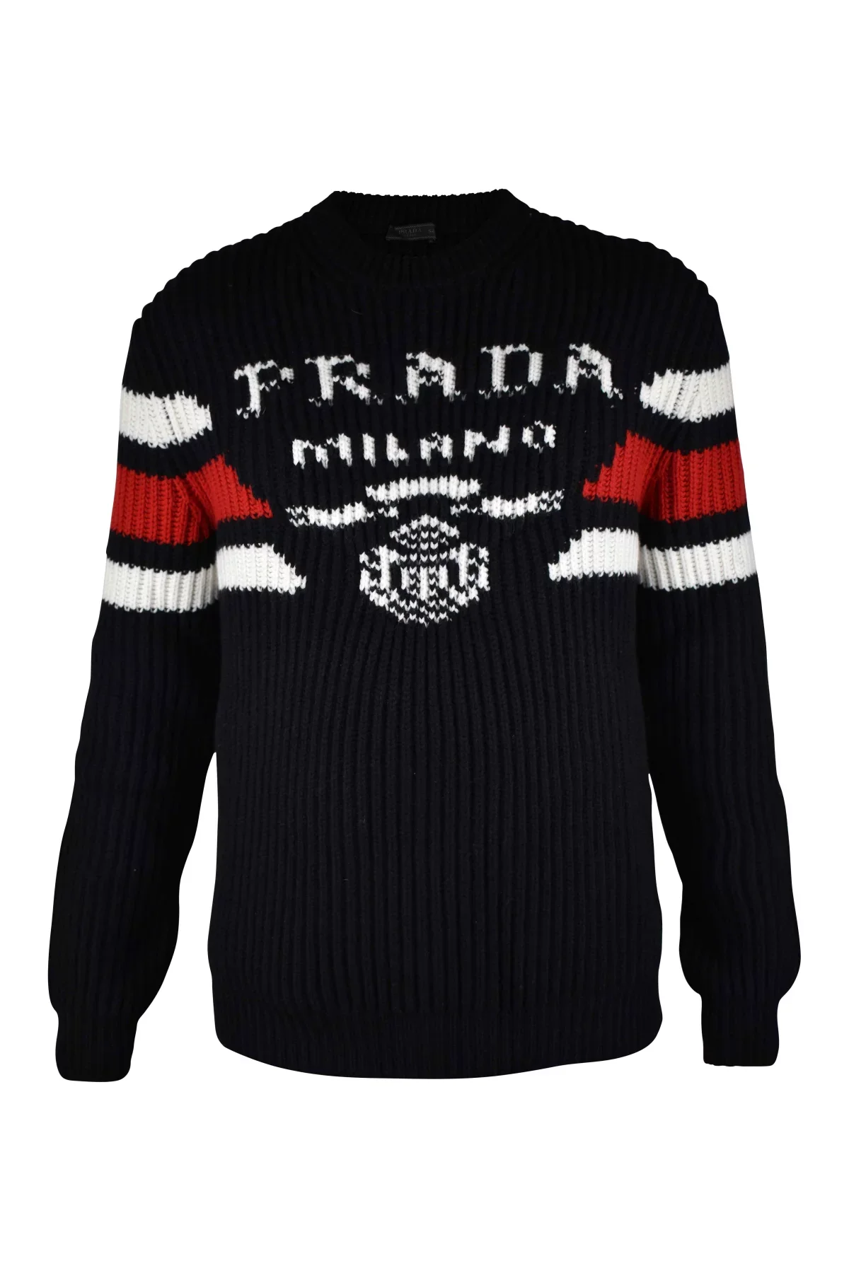 Prada Black cashmere sweater. Horizontal red and white logo on chest. Crew neck. Ribbed edges. Long sleeves. 100% cashmere.