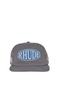 Gray Rhude cotton cap. Blue crest with white logo embroidered on front. Various embroidered details on sides. Straight peak. Green inner peak. Black adjustable back closure.