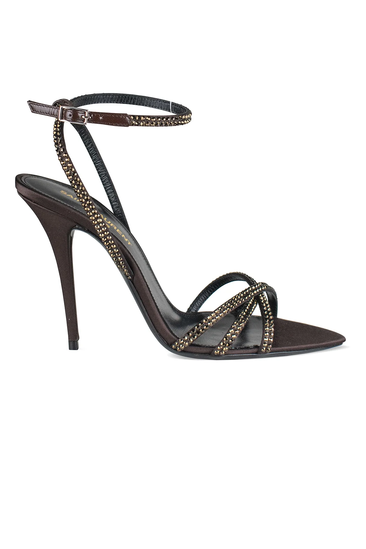 Ava Saint Laurent sandals in brown satin. Crystal embellishments on straps. Ankle strap with buckle closure. Almond toe. 10.5 cm stiletto heel. Made in Italy.