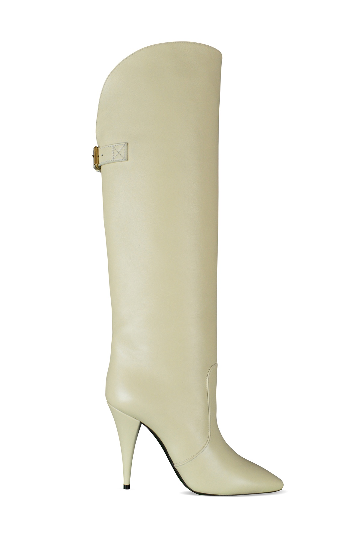 Saint Laurent boots model Harper in smooth beige leather. Almond toe and covered conical heel. Buckle closure at the back. Leather sole. Heel height : 10 cm. 100% calf leather. Made in Italy.