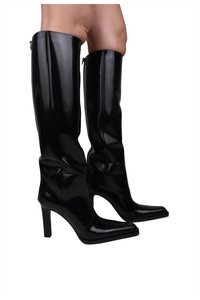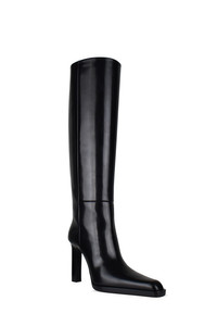 Saint Laurent "Nina" boots in shiny black leather. Silver metal ring at the back. Square pointed toe. 9.5 cm heel. 100% calf leather. Made in Italy.
