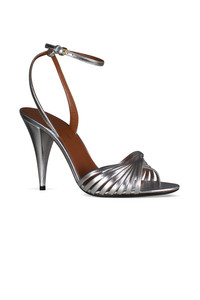 Tina Saint Laurent sandals in silver metallic leather. Round open toe. Overlapping straps on the vamp. Ankle strap with buckle closure. Leather sole. 10 cm heel. Made in Italy.