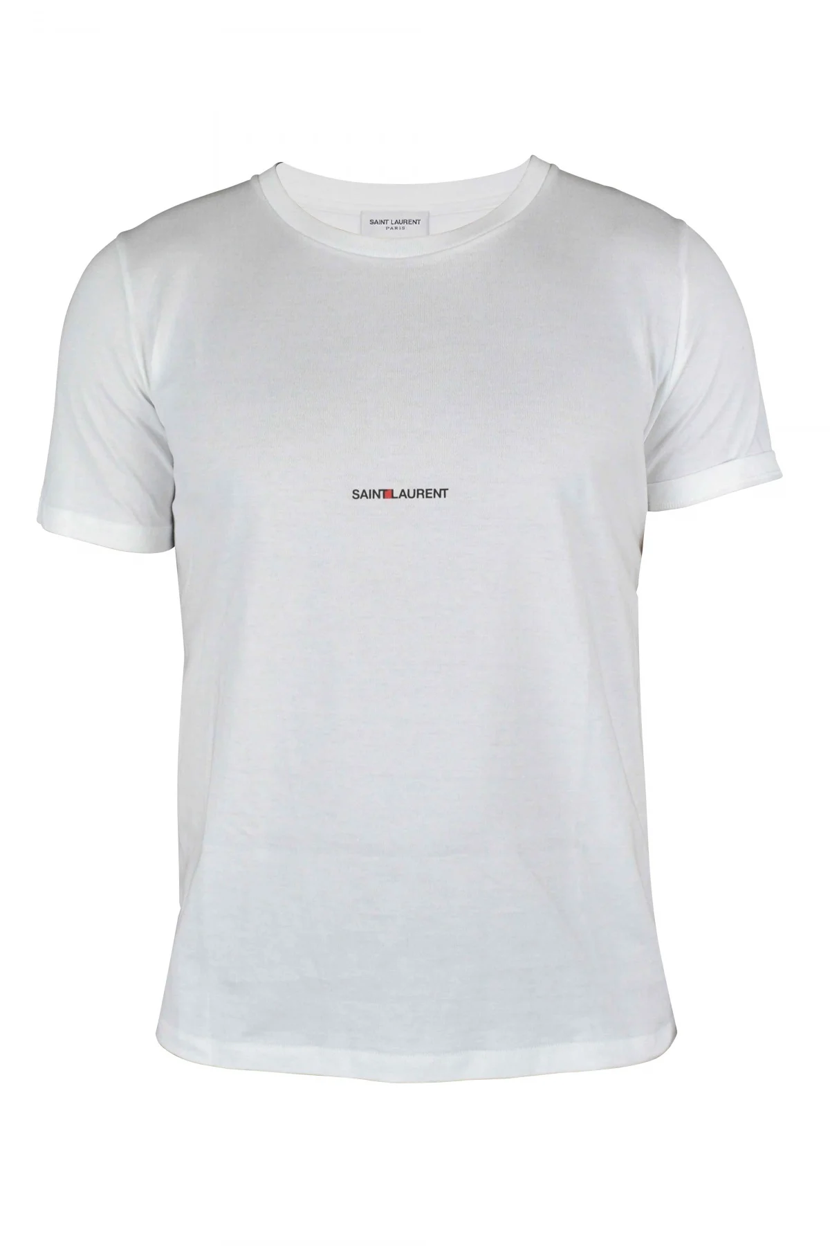 Rive Gauche Saint Laurent white T-Shirt. Black Saint Laurent logo on front. Round collar. 100% cotton. Made in Italy.