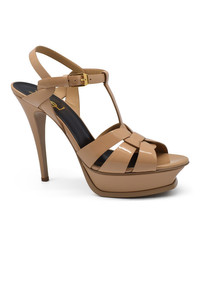 Tribute Saint Laurent sandals in beige patent leather. Adjustable ankle strap with engraved Saint Laurent buckle and beveled platform. Heel height 13 cm including platform 3 cm. Leather sole. Made in Italy.