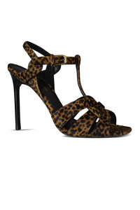 Tribute Saint Laurent sandals in foal. Leopard print. Crisscrossing, adjustable ankle straps with Saint Laurent Paris engraved buckle. Heel height: 10.5 cm. Leather sole. Made in Italy.