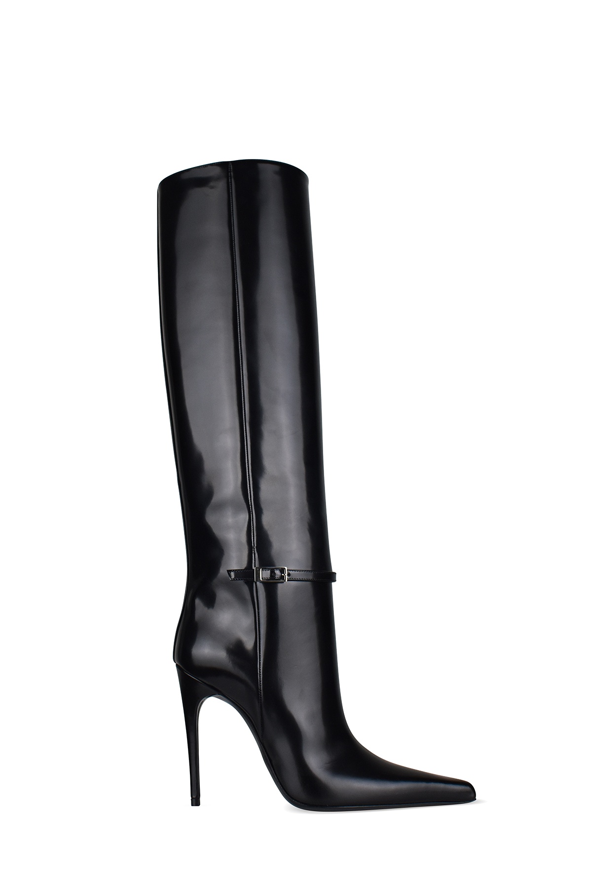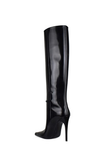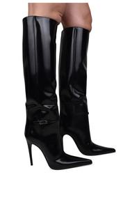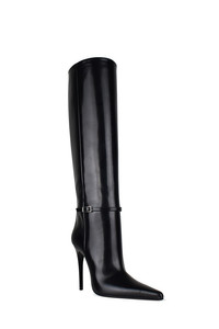 Saint Laurent "Vendome" boots in shiny black leather. Decorative buckle with silver-plated metal finishing. Pointed toe. 11 cm stiletto heel. 100% leather. Made in Italy.