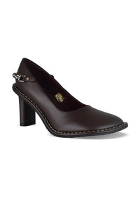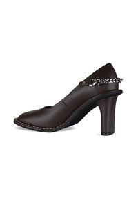 Stella McCartney brown Ryder pumps. Made of VEGEA, vegan leather. Iconic Falabella chain in silver-plated recycled brass. Angular, rounded closed toe. White stitching. Thick 8.5 cm heel. Made in Italy.
