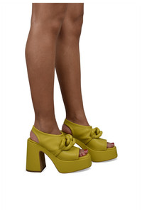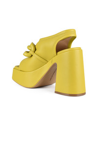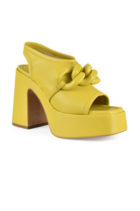 Stella McCartney yellow Skyla wedge sandals. Tonal thick chain at front. Open toe. Platform sole. Heel height: 11 cm. Made in Italy.