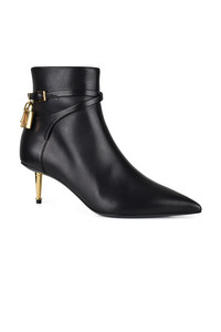 Padlock boots in black leather Tom Ford. Ankle strap with buckle and gold lock. Zipper closure on the side not apparent. Golden heel of 5.5 cm. Pointed toe. Made in Italy.