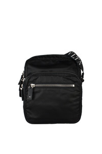 Black Valentino bag model: "messenger". White logo "VLTN" printed on the adjustable shoulder strap. Zipped compartments on the front. Leather logo on the back. Two-way zipper in main compartment. Leather logo and zippered pocket inside. Dimensions: 9cm length x 11cm height x 2cm width. 100% Nylon. Made in Italy.