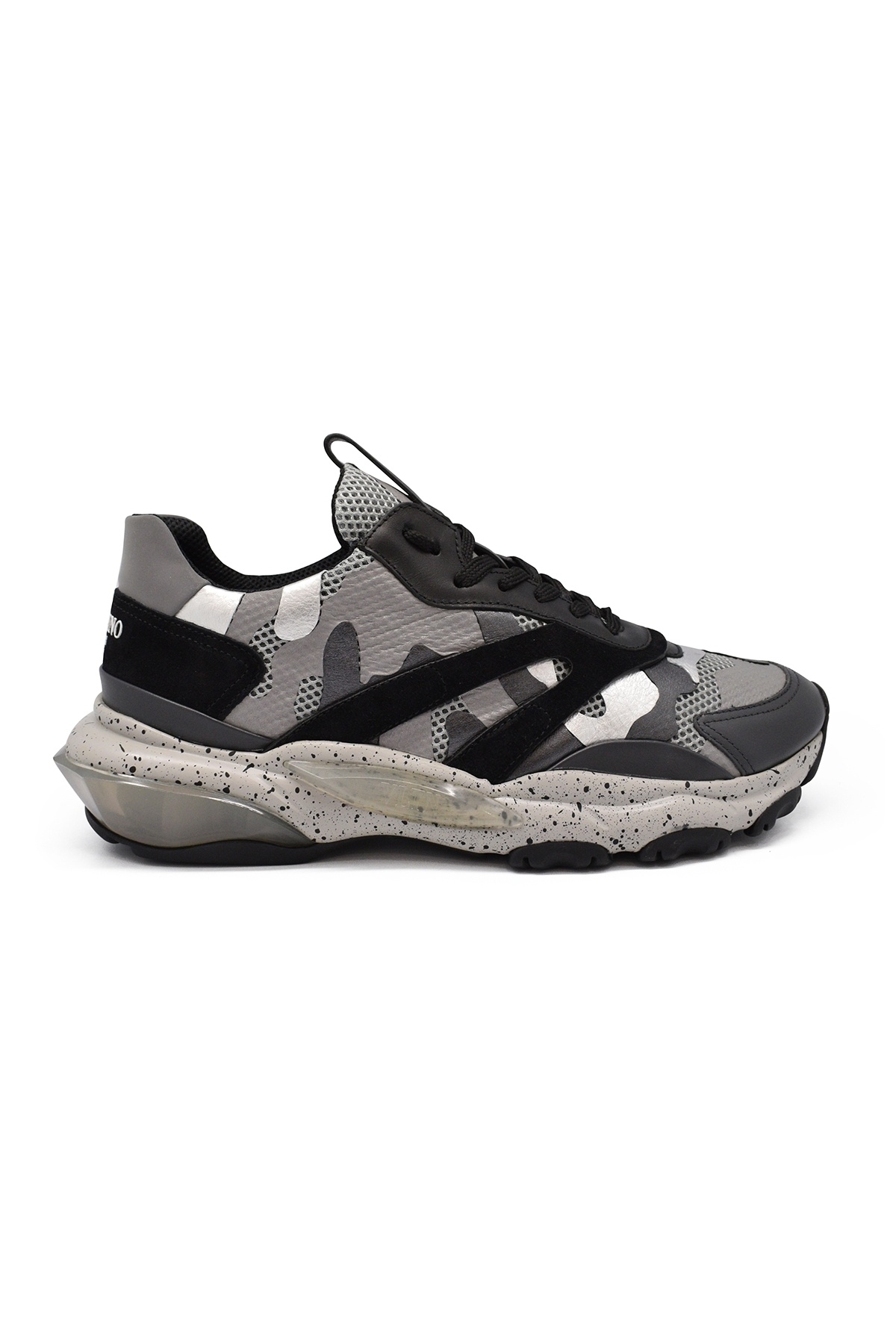 Valentino Bounce Camouflage sneakers in black and silver leather and fabric. VLTN logo on the tongue. Rubber sole with side logo. Made in Italy.