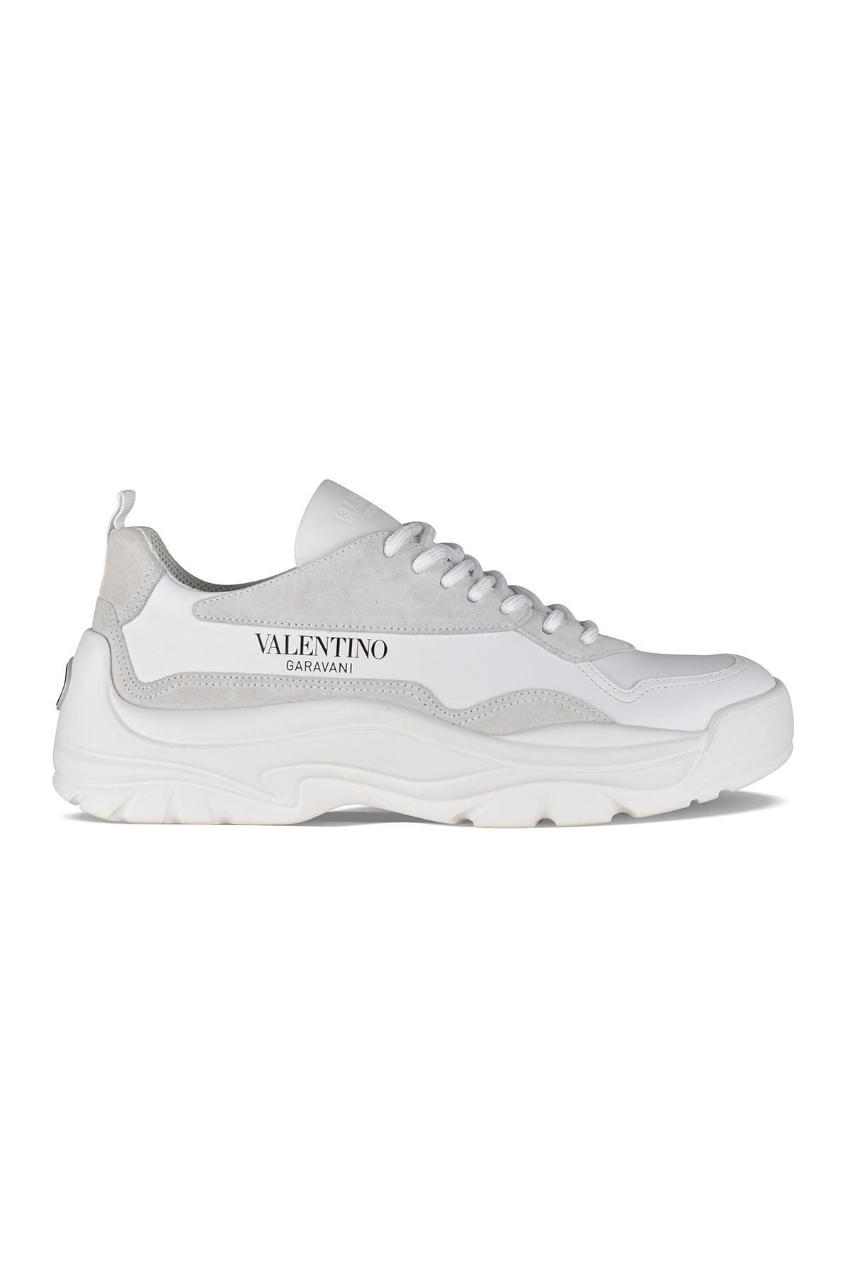 Valentino Garavani Gumboy sneakers in white leather and grey suede. Black Valentino logo on outer side. Embossed logo on tongue. Grey suede counter. Signature black "Vlogo" logo on heel. Rubber sole. Made in Italy.