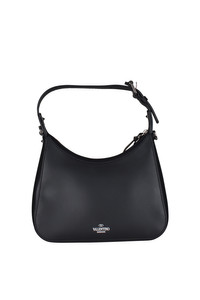 Black VLTN hobo bag. White "VLTN" logo on front. Iconic metal studs. Printed logo at back. Black removable shoulder strap. Adjustable handle. Zipper closure. Dimensions: depth 8 cm x height 16 cm x width 25 cm. Smooth leather. Made in Italy.