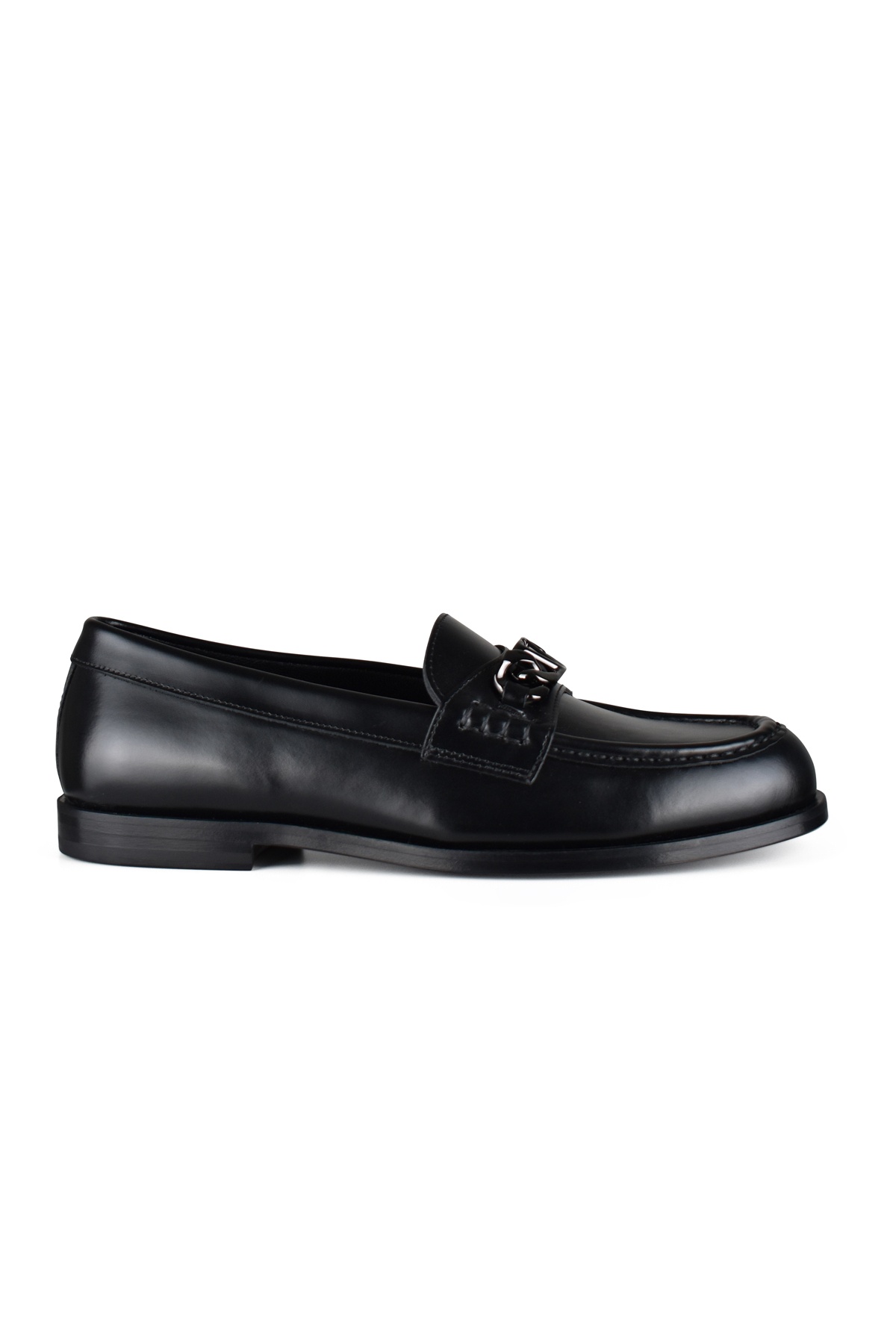 Valentino black loafers. In smooth leather. Anthracite grey chain on top with logo. Round toe. Black sole. Made in Italy.