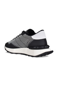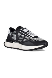 Valentino Garavani Netrunner sneakers. Black and white fabric and leather. Signature "V" logo in leather. Rubber sole with rubber stud detail at rear. White leather counter. Made in Italy.