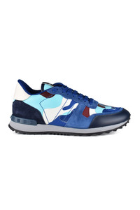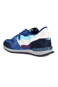 Rockrunner Sneakers camouflage Valentino blue, white and red. In white suede and leather. Decorative rubber studs. White leather counter. Grey rubber notched sole. Lace-up closure. Made in Italy.
