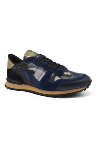 Valentino sneakers Rockrunner model Blue and gray camouflage in fabric and nappa. Rubber stud details at the back. Beige leather buttress. Rubber sole. Made in Italy.